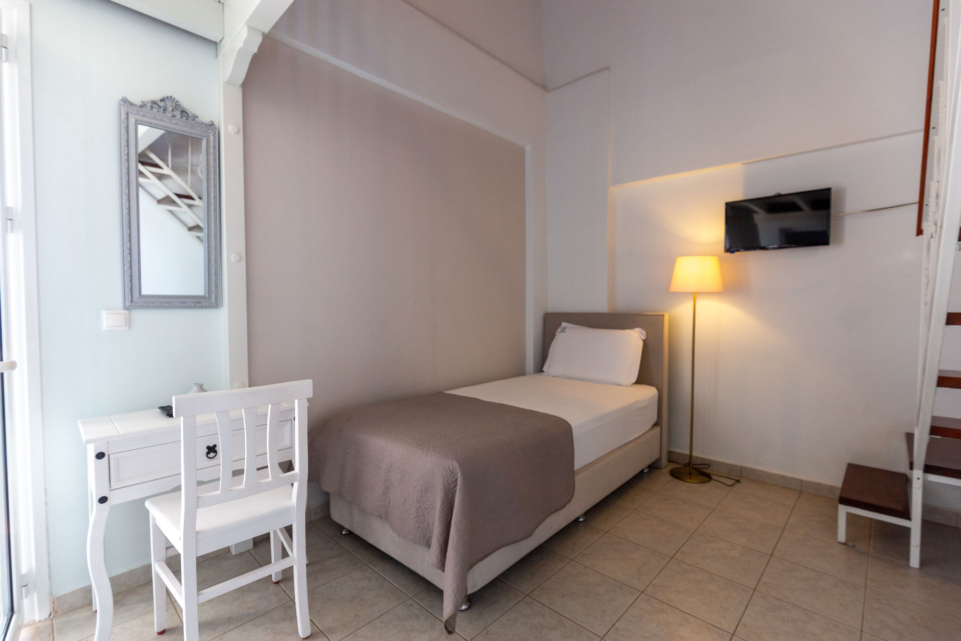 Στο πρώτο επίπεδο κάθε μεζονέτας υπάρχει καθιστικό και ένα μονό κρεβάτι.