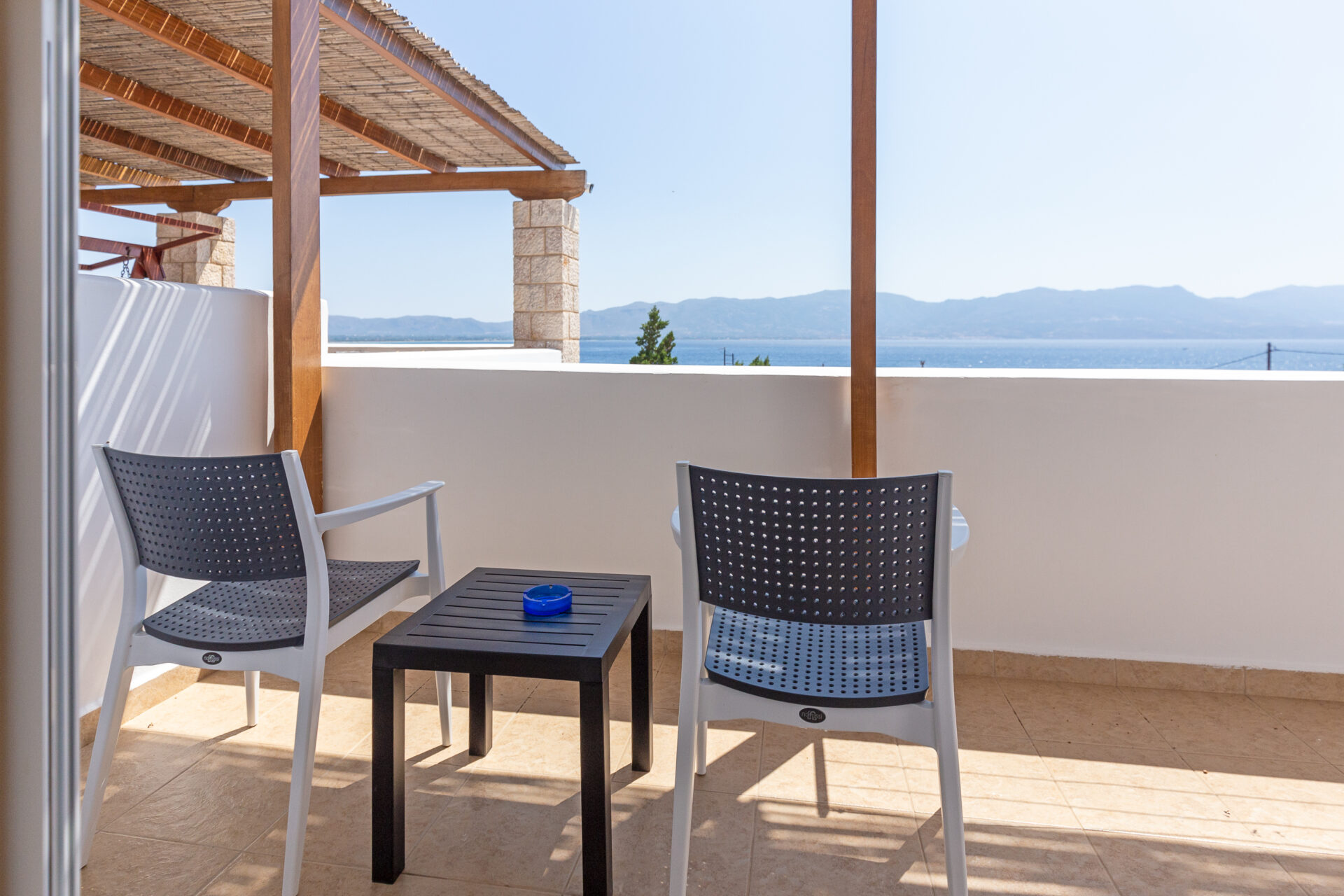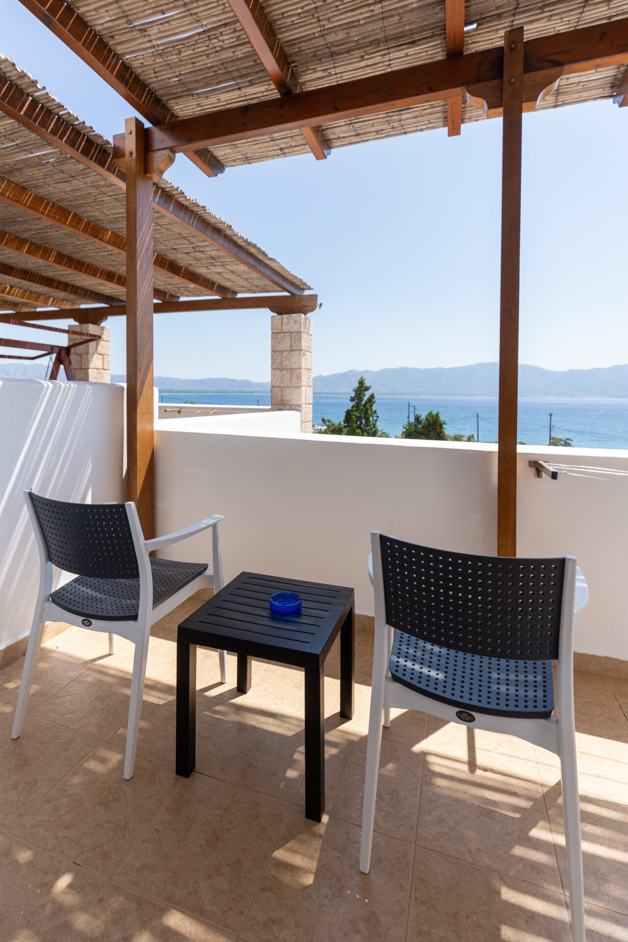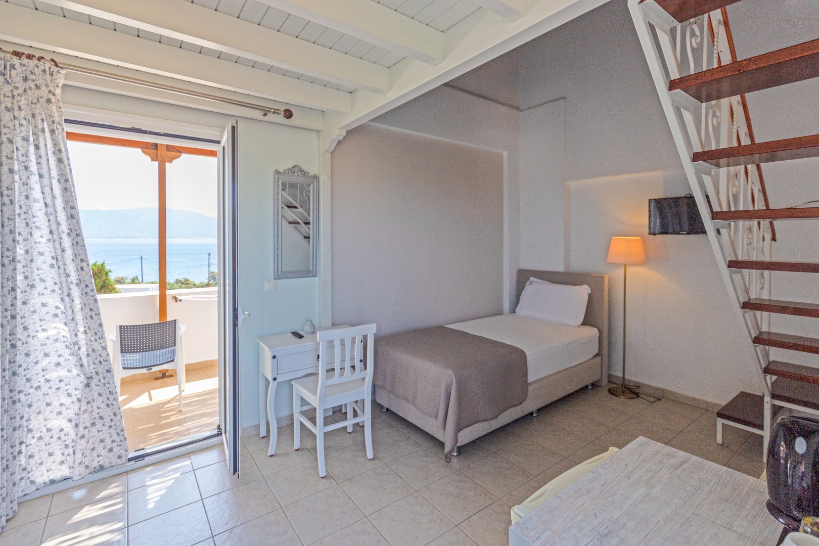 Στο ίδιο επίπεδο υπάρχει το μπαλκόνι του δωματίου με απεριόριστη θέα στη θάλασσα και το μπάνιο του.